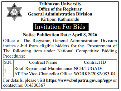 | 207 | Tribhuvan International Airport Civil Aviation Office, Gauchar | Annual Grass Cutting for Preservation of Runway, Taxiway, Apron and other Associated Works at TIA | 07/04/2026 | PPMO | 06/05/2026 | Click Here | |