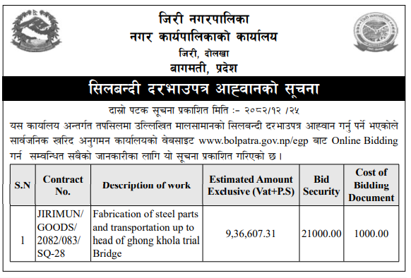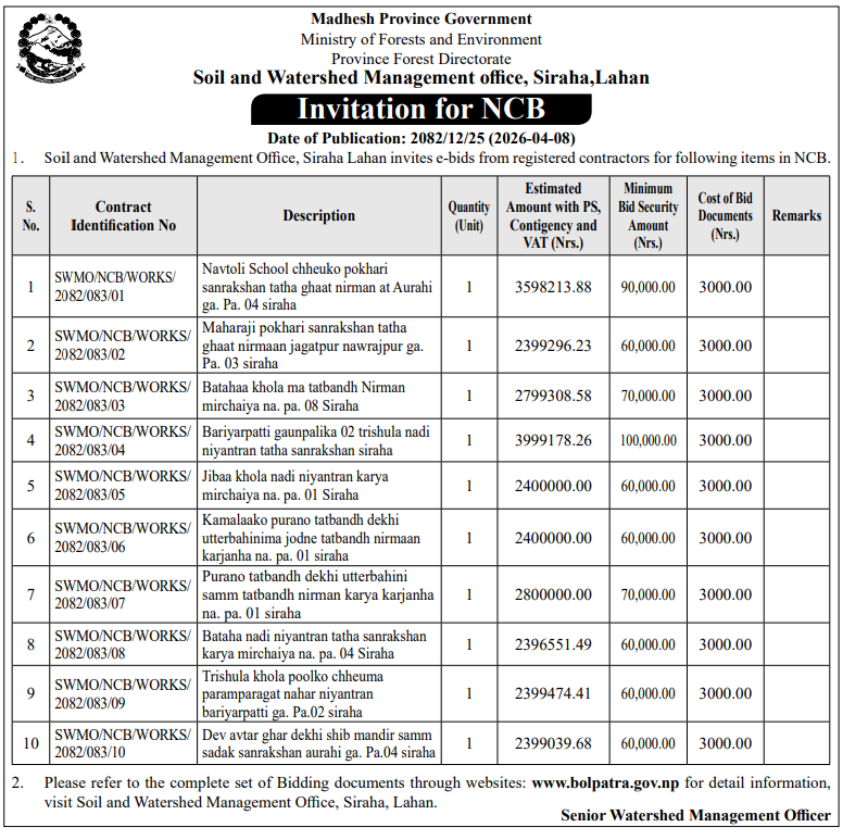 | 27 | Kalinchok Rural Municipality, Sunkhani | Yabalkhola Gabion Jali Byabasthapan ,Kalinchok Rural Municipality-01,Dolakha | 07/04/2026 | PPMO | 22/04/2026 | Click Here | |