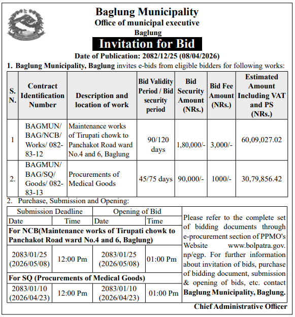| 184 | Bhaktapur Municipality | Supply and Delivery of Laptops and Digital ID Card Printer. | 07/04/2026 | PPMO | 15/04/2026 | Click Here | |