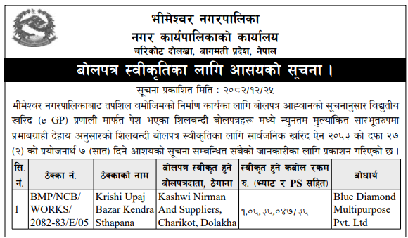 | 232 | Belaka Municipality Office, Rampur Udayapur | Construction of Truss Shed and Bandada Agriculture Market Management, Belaka-2 | 07/04/2026 | PPMO | 22/04/2026 | Click Here | |