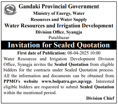 | 217 | Water Resources and Irrigation Development Division, Sindhupalchowk | Tallo Bagar Nadi Niyantran" Construction of GI box wall" | 07/04/2026 | PPMO | 23/04/2026 | Click Here | |