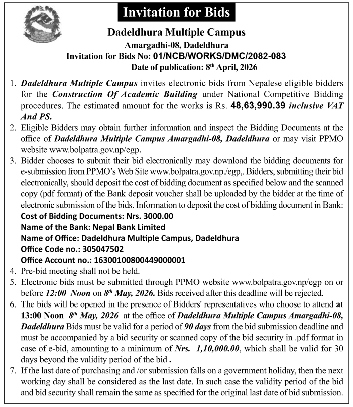 | 195 | Bhajani Municipality,Office of Municipal Executive | Construction of Shree Durga Secondary School in ward no 03 of Bhajani Municipality | 07/04/2026 | PPMO | 07/05/2026 | Click Here | |