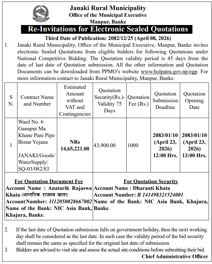 | 24 | Janaki Rural Municipality, Banke | Ward No. 6 Ganapur Ma Khane Pani Pipe Bistar Yojana | 07/04/2026 | PPMO | 22/04/2026 | Click Here | |