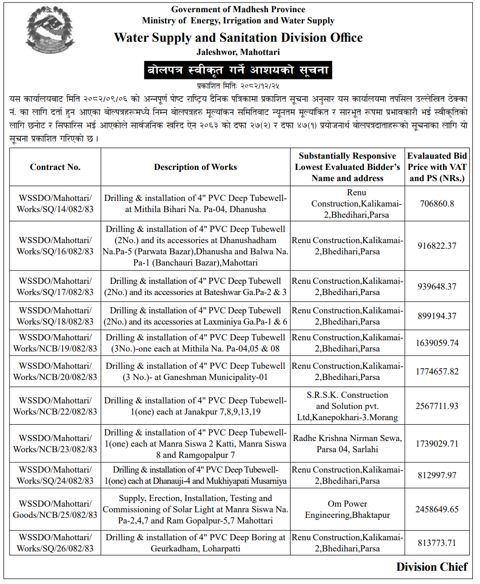 | 214 | Ground Water Resource and Irrigation Development Division Office, Siraha | Construction of 6 inch dia.Power drill Tubewell with well Development and Installation of Pump Accessories at Chhinnamasta R.M.-4, Lalapatti, Saptari. | 07/04/2026 | PPMO | 23/04/2026 | Click Here | |