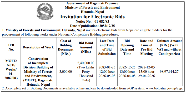 | 48 | Shree Manakamana Community Forest | Tikani Dekhi Deurali Ghat Ra Pharmacy Kshetra Tarbar Ban Kshetrama | 07/04/2026 | PPMO | 22/04/2026 | Click Here | |