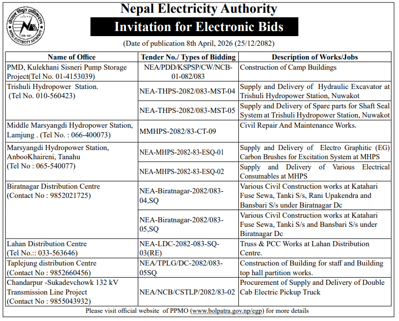 | 35 | NEA, Pokhara Grid Division | Bio-engineering works at tower no.9, Guithebhir, Myagdi | 07/04/2026 | PPMO | 22/04/2026 | Click Here | |