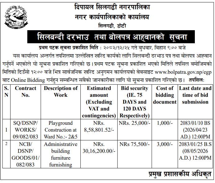 | 206 | Birendranagar Municipality, Surkhet | Interior Works of Administrative Building of Birendrangar Municipality & Supply Delivery of Furniture, Birendrangar Surkhet | 07/04/2026 | PPMO | 06/05/2026 | Click Here | |