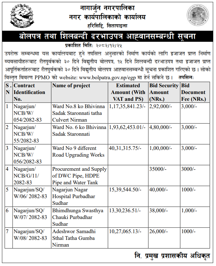 | 7 | Sundarbazar Municipality | khahare gahahate sadak ra machhapuchre culvert daya baya dhalan marmat | 07/04/2026 | PPMO | 22/04/2026 | Click Here | |