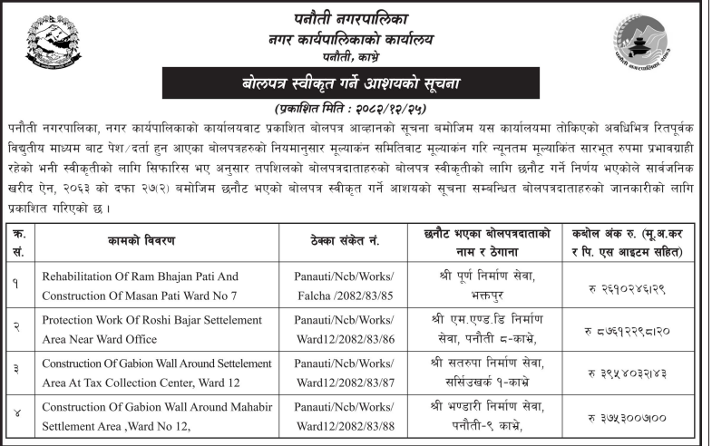 | 18 | Shantinagar Rural Municipality | Bahula khola ko kasipur Ghat | 07/04/2026 | PPMO | 22/04/2026 | Click Here | |