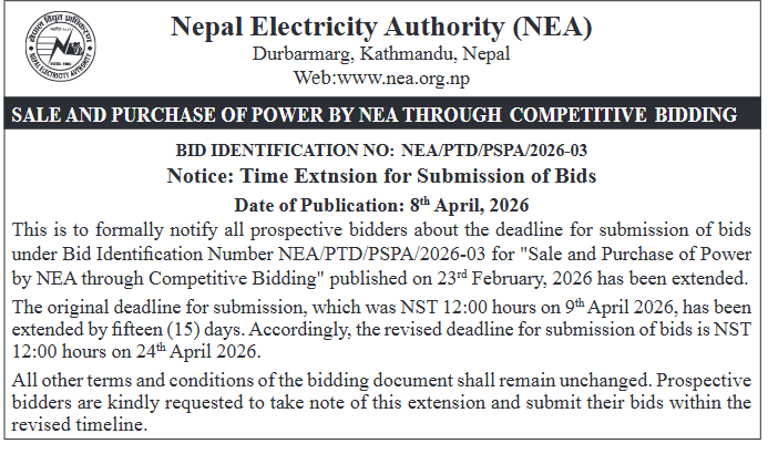 | 162 | NEA, Pokhara Grid Division | Supply,Delivery and Installation of 110V VRLA Batteries at Pokhara Grid. | 07/04/2026 | PPMO | 22/04/2026 | Click Here | |