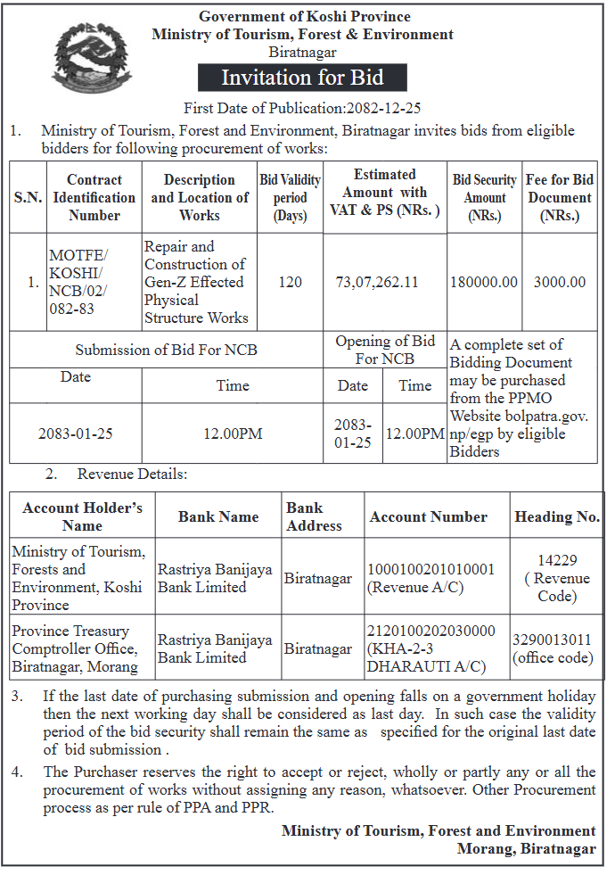 | 28 | Koshi Tappu Wildlife Reserve | Construction of Solar offset Electric Fencing | 07/04/2026 | PPMO | 22/04/2026 | Click Here | |