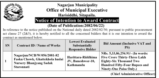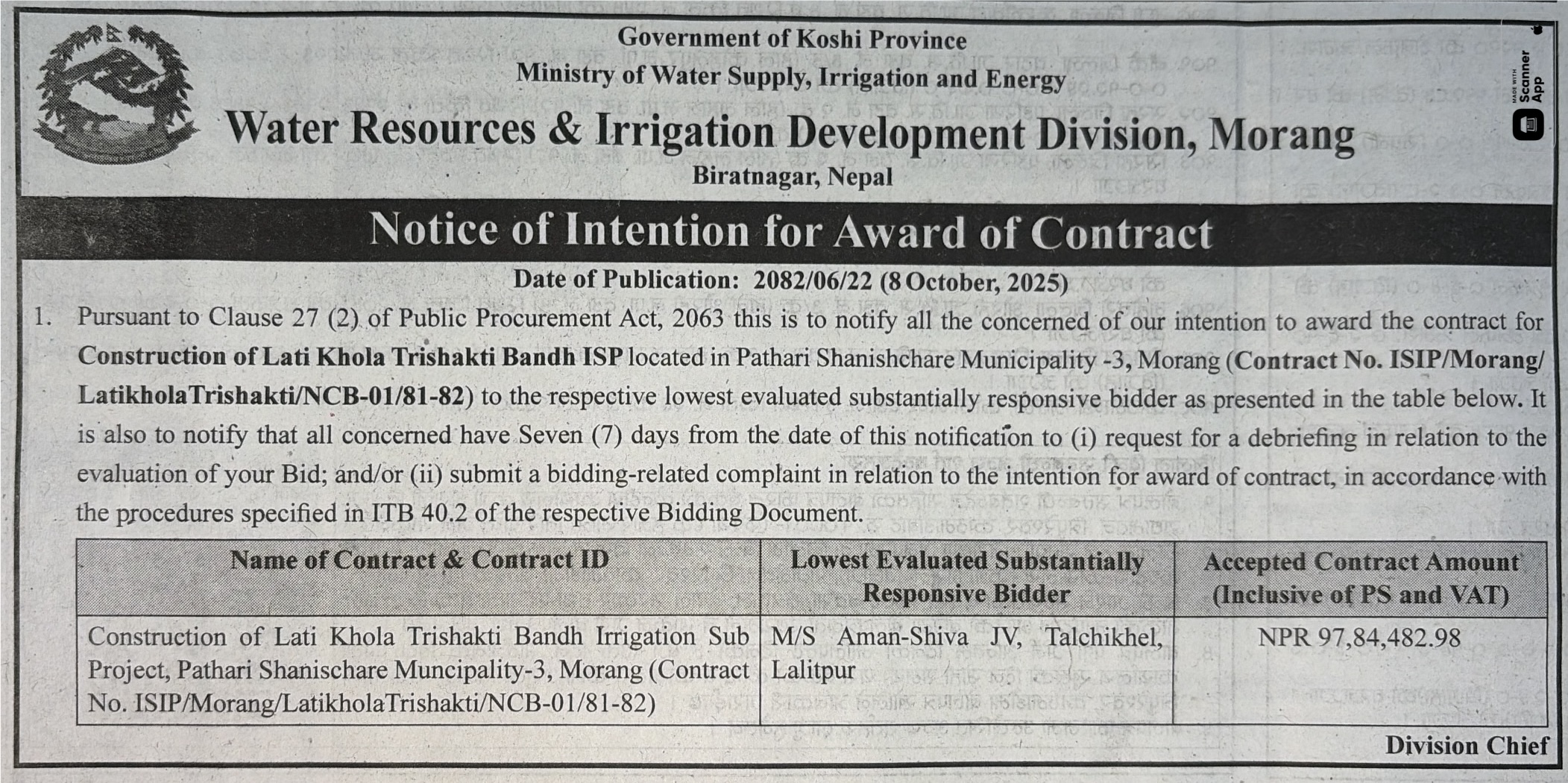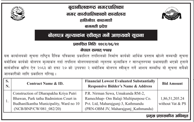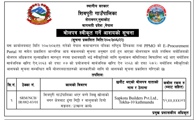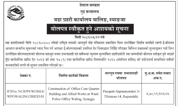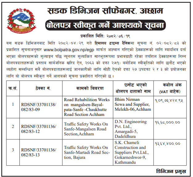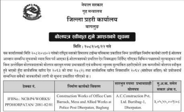 बोलपत्र स्विकृत ; Bid Award (Construction only) 08/10/2025 (Wednesday)