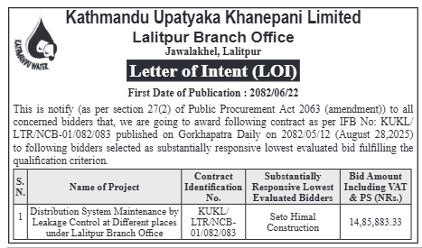 - Award Notice : Road Upgrading Work At Various Places (Swornikita Construction and Suppliers, Gatishil-Gravity JV) |