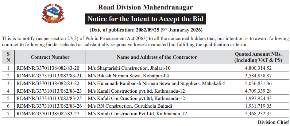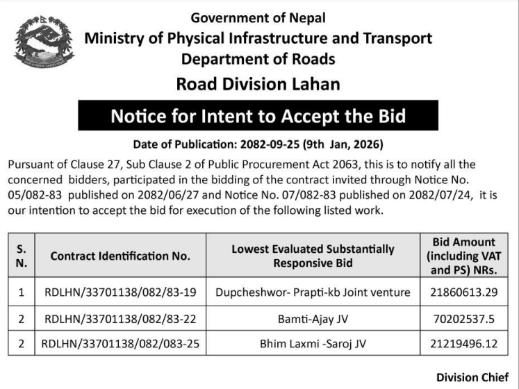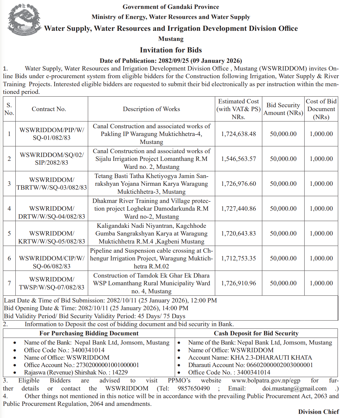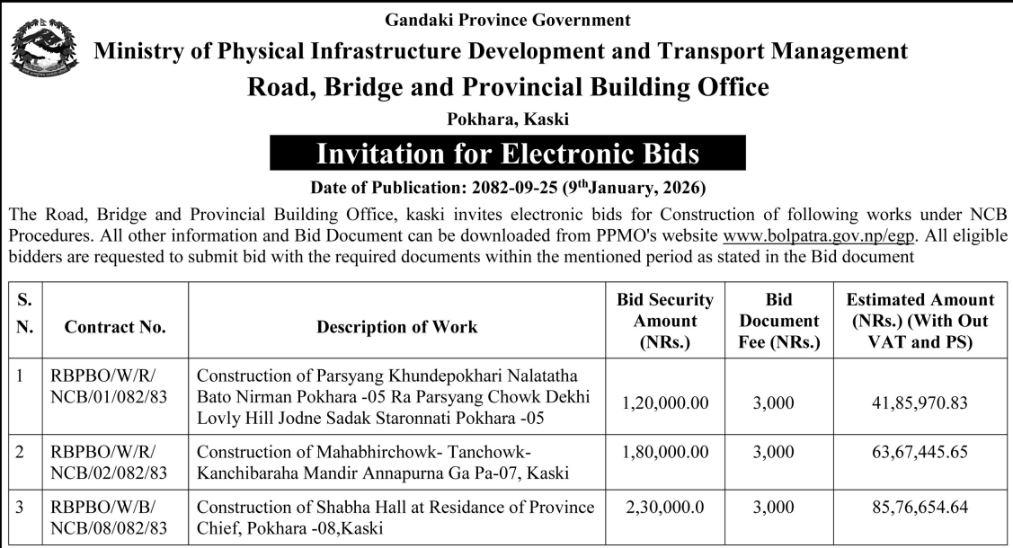 | 35 | Road Division, Baglung | Road Improvement works along Mid Hill Highway Devisthan-Nisi-Patihalne Road Section (Ch 1080+960-1095+460); RDBLG/337011384/082/83-20 | 08/01/2026 | PPMO | 06/02/2026 | Click Here | |