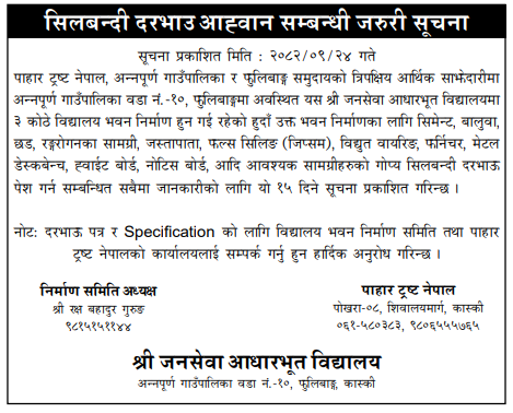 | 162 | Shree Manakamana Community Forest | Construction of Adhuro Boundary Wall and Paleghar Nirman | 08/01/2026 | PPMO | 09/02/2026 | Click Here | |