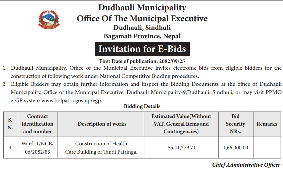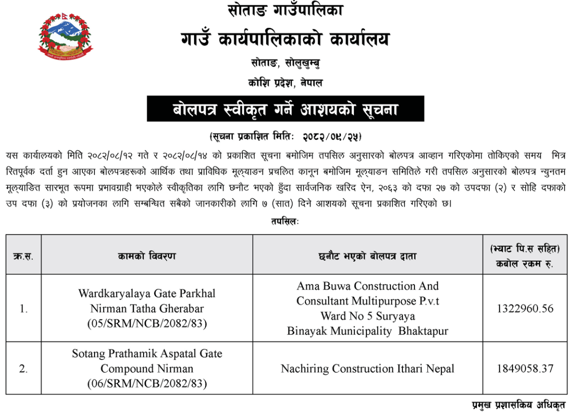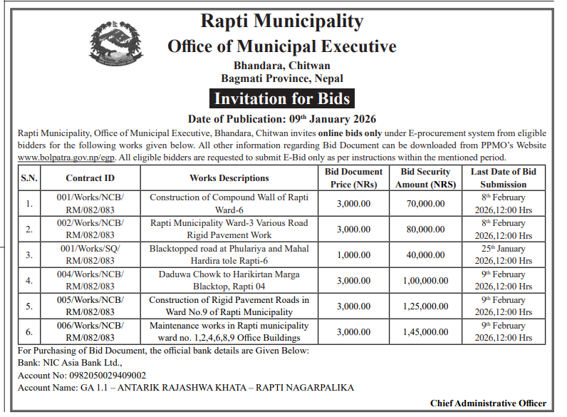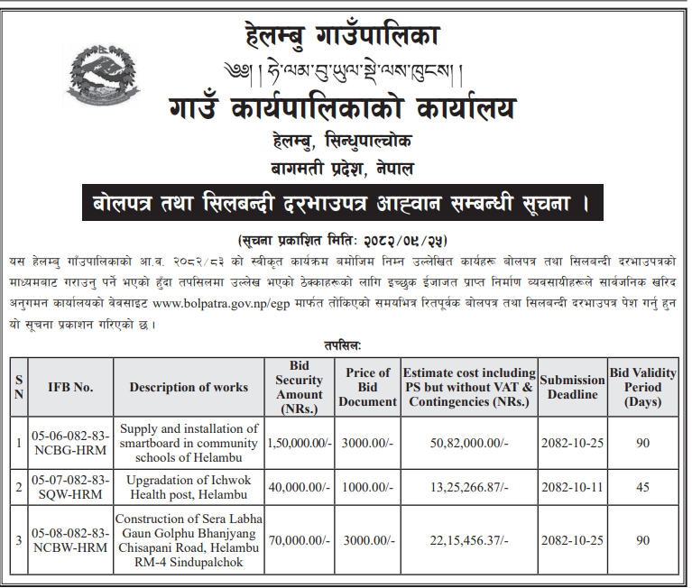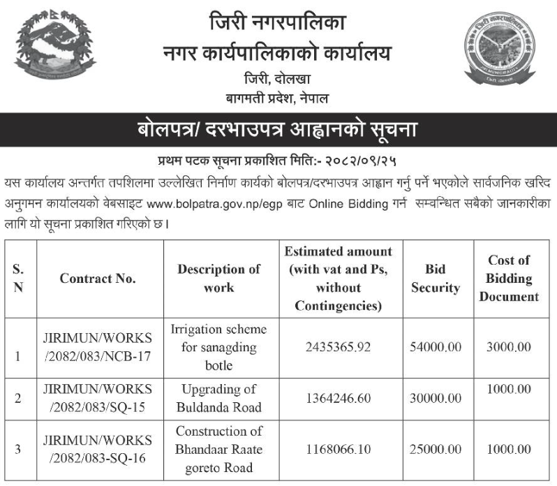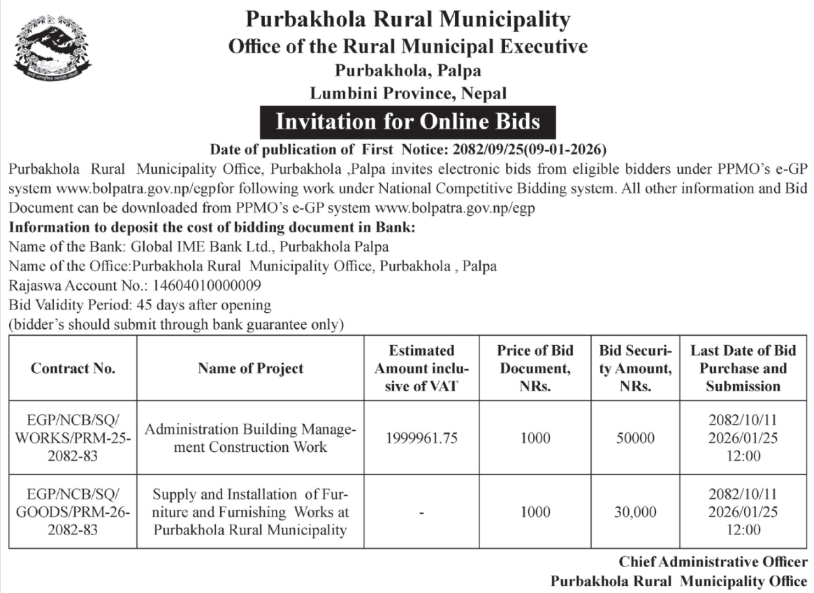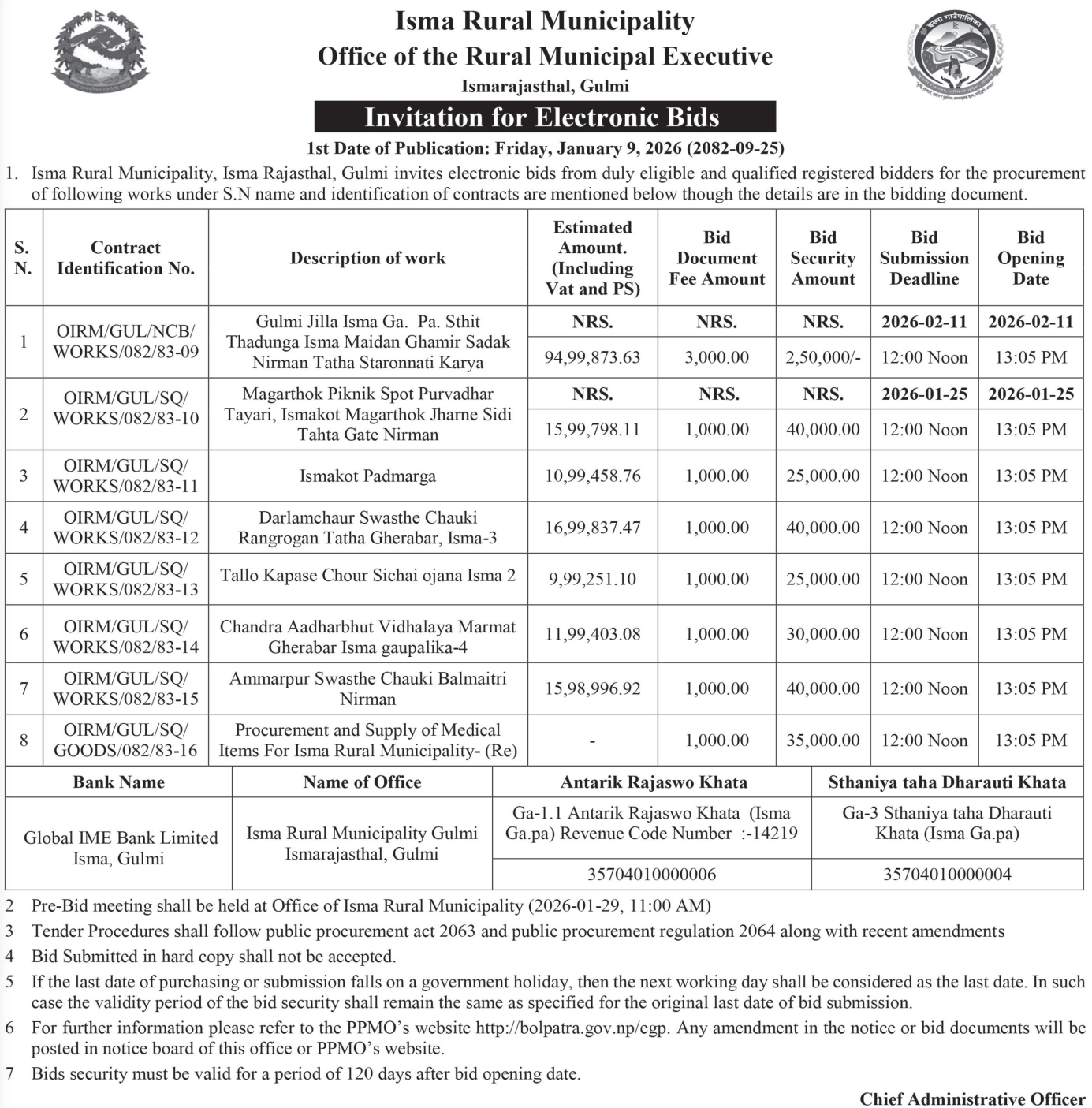 | 9 | Guthichaur Rural Municipality Office, Karnali Province, JUMLA; | Construction of wada office building | 08/01/2026 | PPMO | 08/02/2026 | Click Here | |