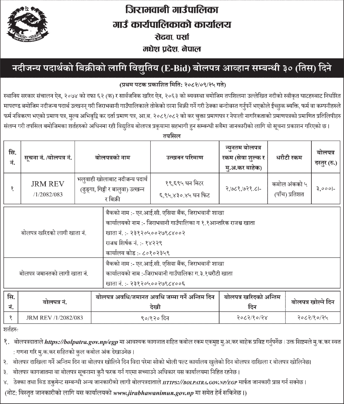 | 43 | Jaimuni Municipality Office, Gandaki Province, BAGLUNG; | Procurement for the Extraction,Collection and Sale Revenue of Kaligandaki(Majhabagar, thanebagar) Riverbed Materials | 08/01/2026 | PPMO | 23/01/2026 | Click Here | |