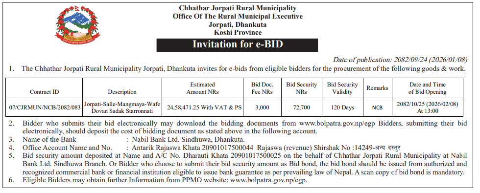 | 174 | Chhathar Jorpati Rural Municipality | Jorpati-Salle-Mangmaya-Wafe Dovan Sadak Starronnati | 08/01/2026 | PPMO | 08/02/2026 | Click Here | |