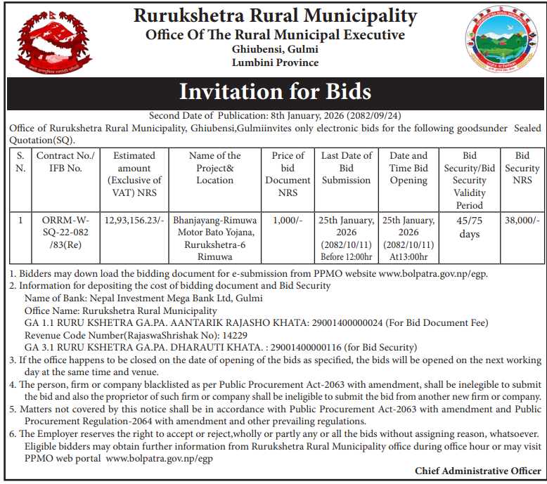 | 41 | Rurukshetra Rural Municipality | Bhanjayang-Rimuwa Motor Bato Yojana, Rurukshetra-6 Rimuwa | 08/01/2026 | PPMO | 25/01/2026 | Click Here | |