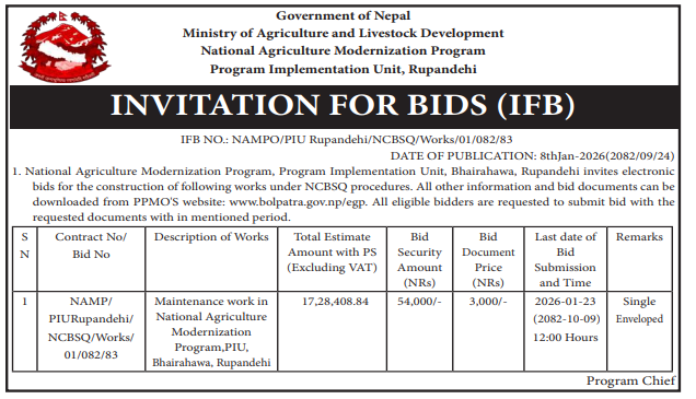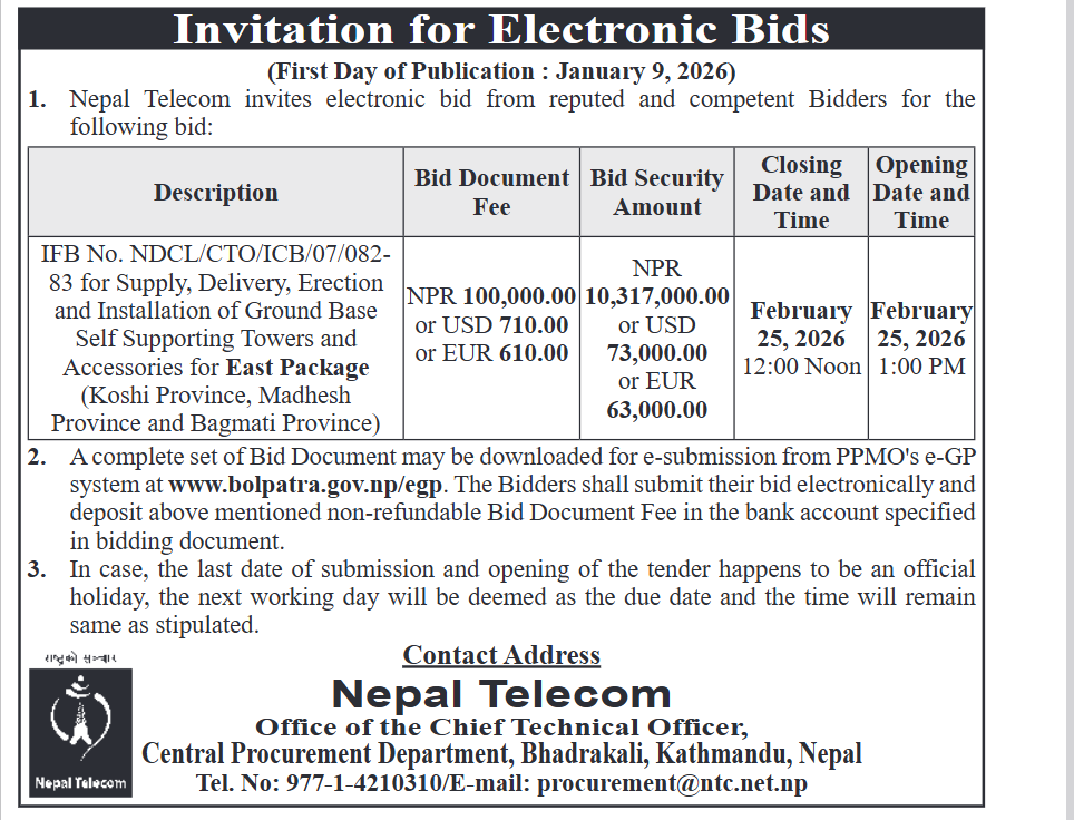 | 185 | NEA, Community Rural Electrification Department | “SUPPLY, DELIVERY, INSTALLATION AND REHABILITATION OF 11/0.4-0.23 KV ELECTRICAL DISTRIBUTION NETWORK AT THE DISTRIBUTION AREA OF HIMCHULI BAHUUDDESHIYA SAHAKARI SANSTHA LTD., MIKLAJUNG, MORANG (PACKAGE-A), CHULACHULI GRAMIN BIDHYUT SAHAKARI SANSTHA LTD, ILAM (PACKAGE-B) & GAUMUKHI BIDHYUT SAHAKARI SANSTHA LTD., YANGBARAK THARPU, PANCHATHAR (PACKAGE-C).” | 08/01/2026 | PPMO | 08/02/2026 | Click Here | |