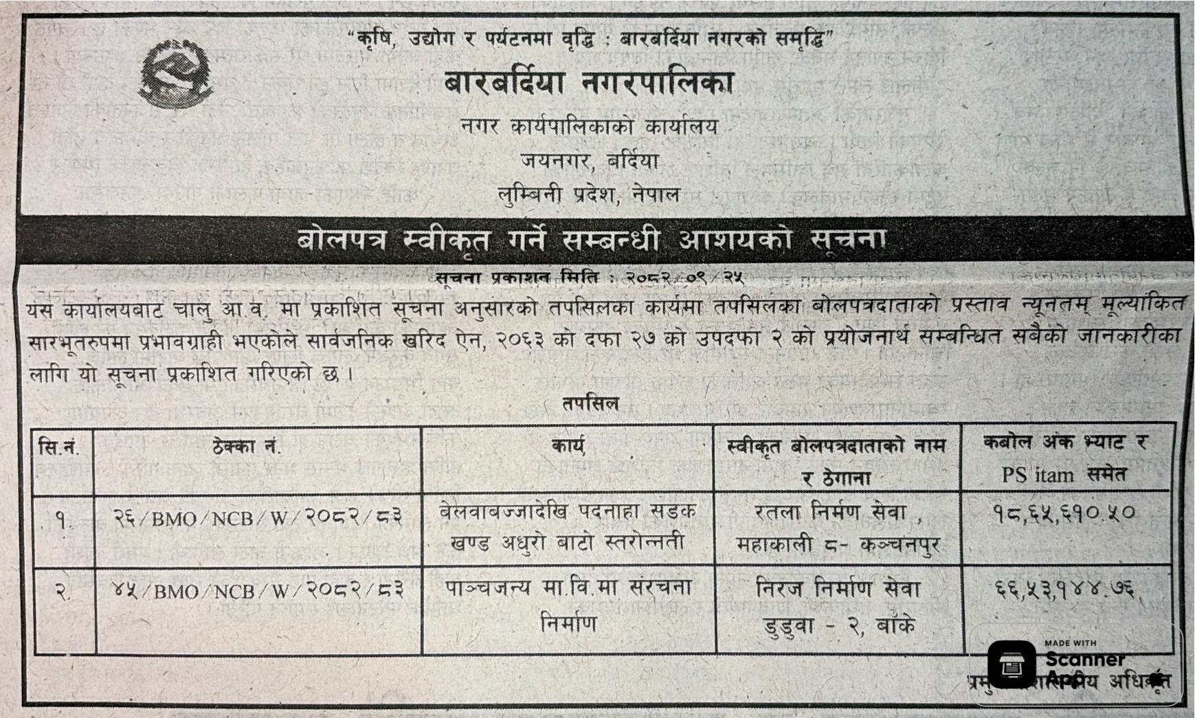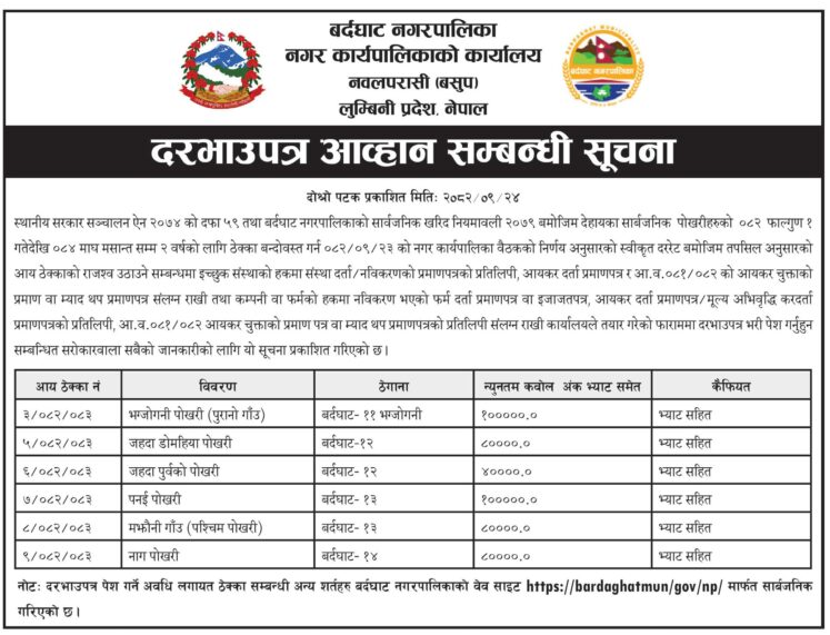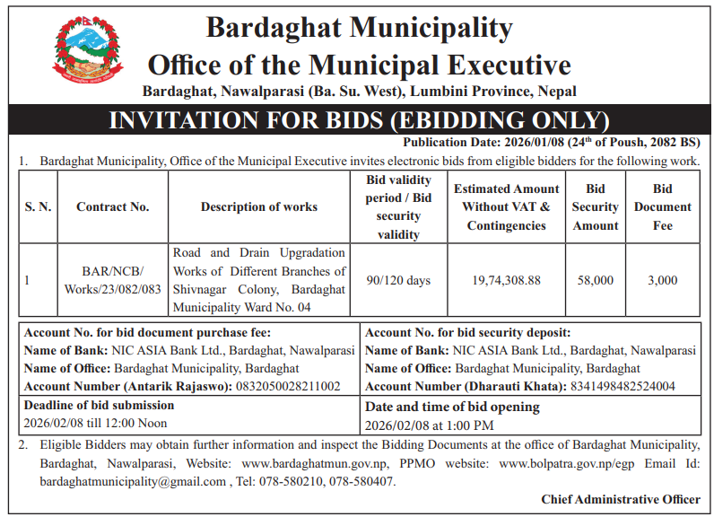 | 182 | Bardaghat Municipality Office, Lumbini Province, NAWALPARASI WEST; | Road and Drain Upgradation Works of Different Branches of Shivnagar Colony, Bardaghat Municipality Ward No. 04 | 08/01/2026 | PPMO | 08/02/2026 | Click Here | |