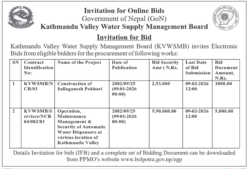 | 163 | Koshi and Bokraha river Management Project | Construction of Pump house and Overhead Tank, M/S fitting and Pump installation, Electrification and Distribution System of Deep tube well at Belaka-04, Laal Bazar and Gurung Chauri, Udayapur District | 08/01/2026 | PPMO | 09/02/2026 | Click Here | |