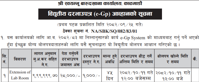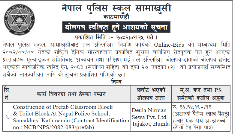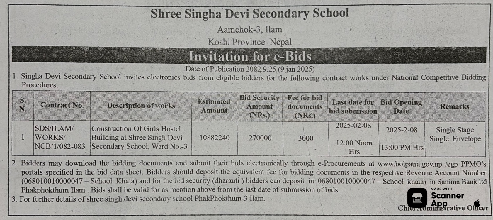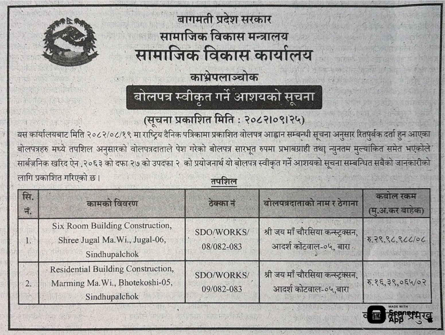 | 17 | Panauti Municipality Office, Bagmati Province, KAVREPALANCHOK; | sachitirtha gurukul purbadhar nirman | 08/01/2026 | PPMO | 08/02/2026 | Click Here | |