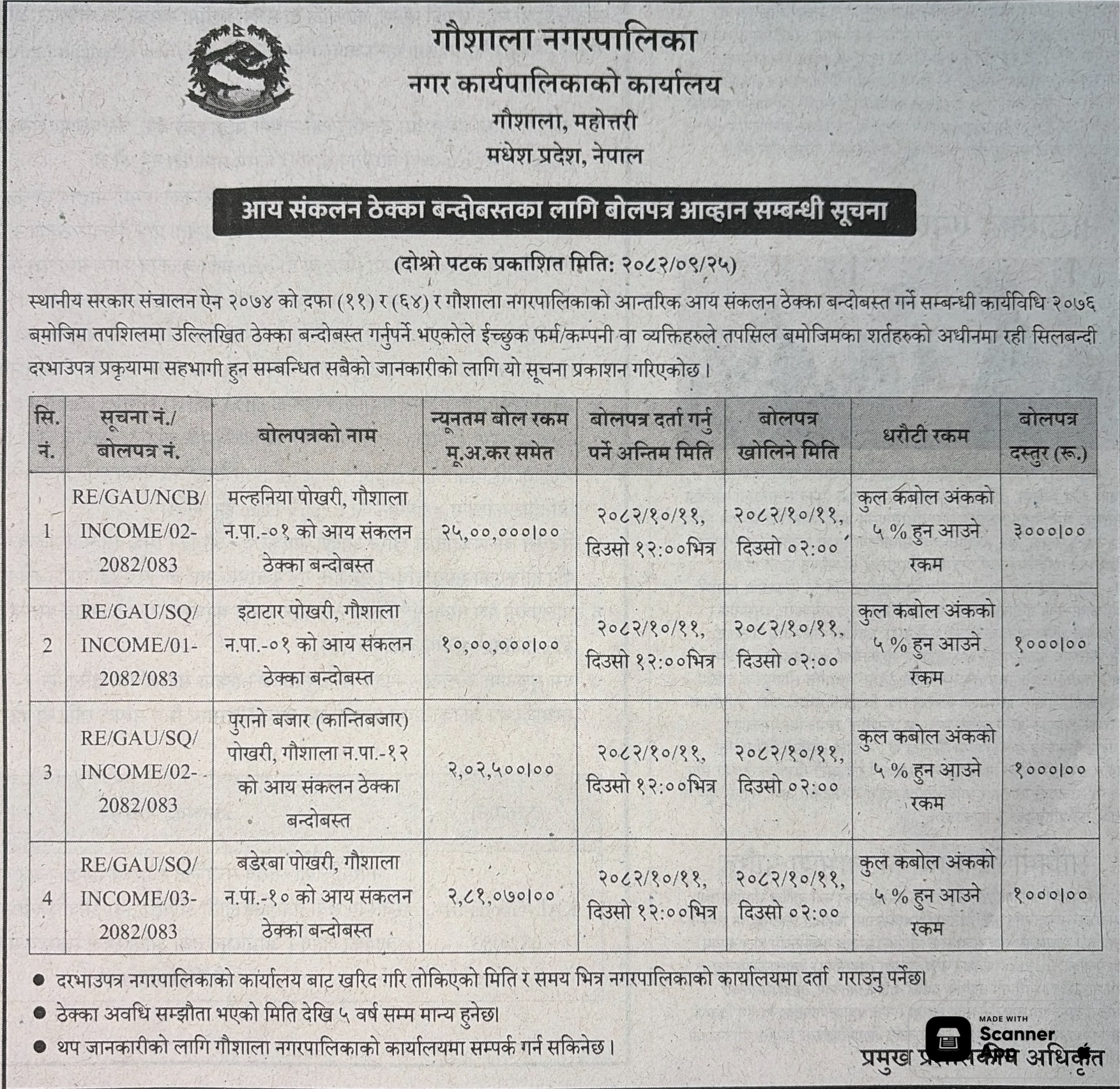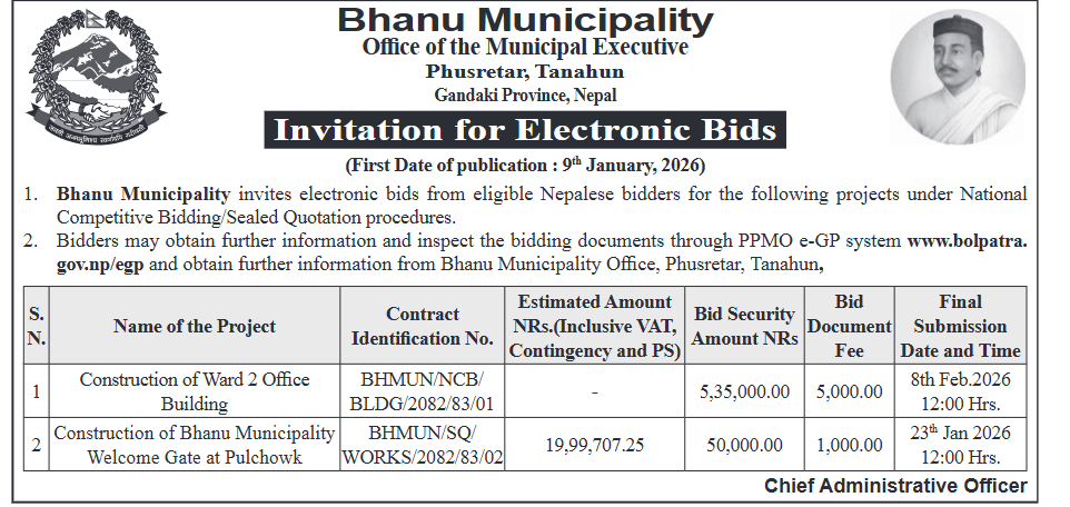 | 122 | Office of Vyas Municipality, Tanahun | Sales of MadiSeti River Natural Resources (Stone, Aggregate and Sand) From Niuro Ghari Upto Khahare Dadhakhola | 08/01/2026 | PPMO | 18/01/2026 | Click Here | |