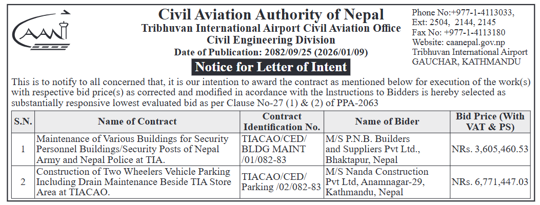 | 128 | Pokhara International Airport Civil Aviation Office | Supply, Delivery, Installation and Testing of Digital Voice Logging Recorder at Fewa Airport. | 08/01/2026 | PPMO | 08/02/2026 | Click Here | |