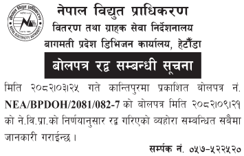 | 149 | NEA, Biratnagar Distribution Center | Supply, Delivery of Miscellaneous Item & Printing works. | 08/01/2026 | PPMO | 23/01/2026 | Click Here | |