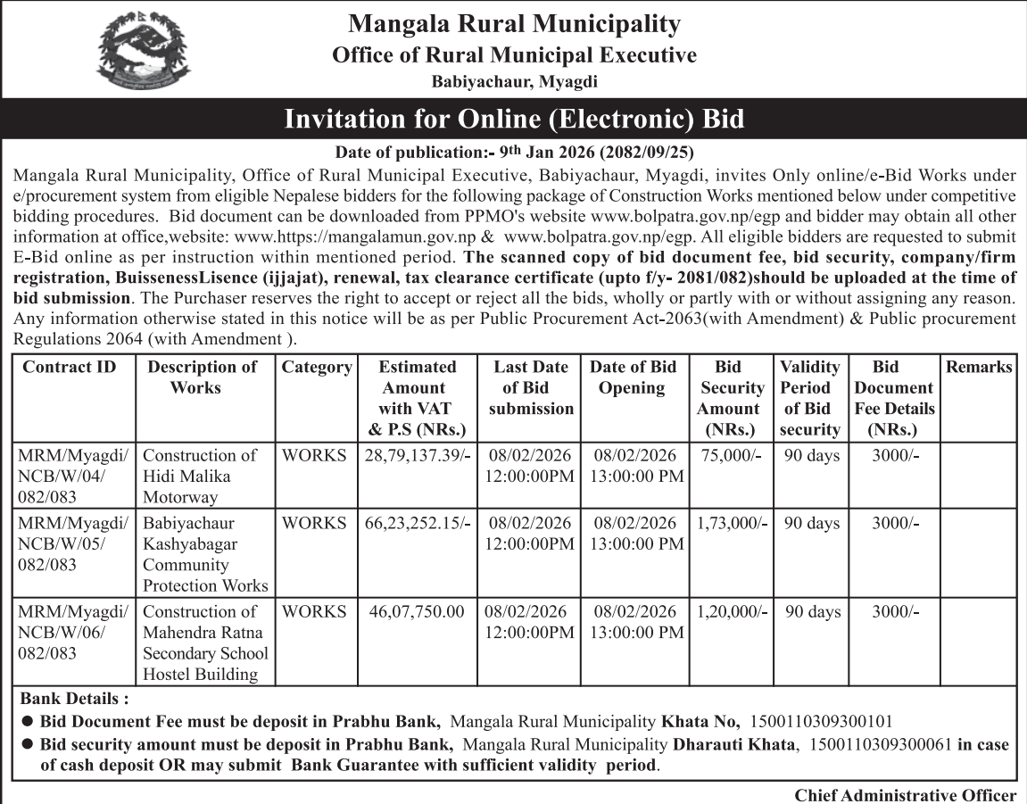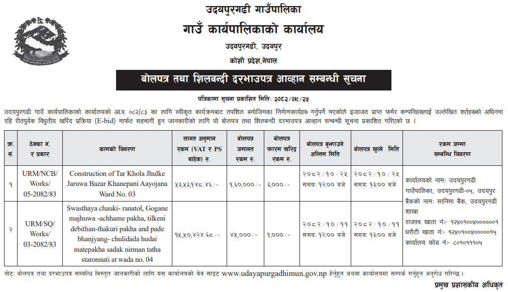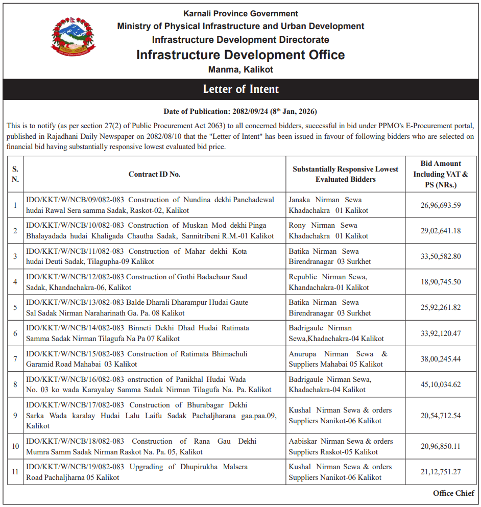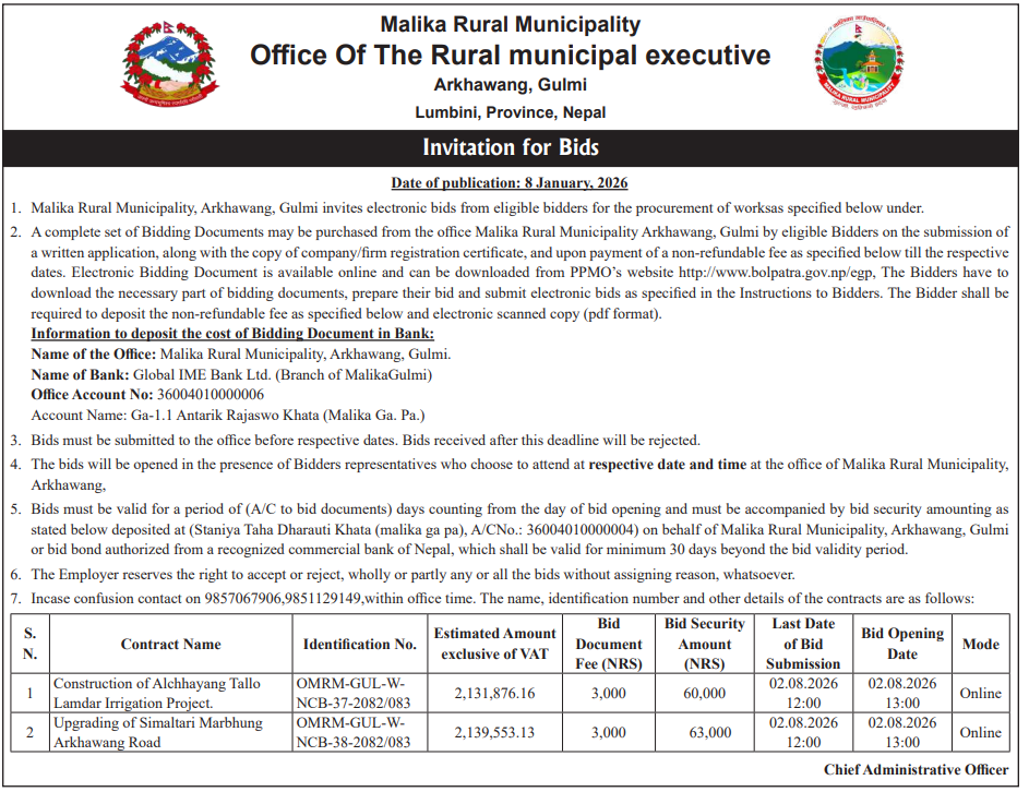 | 16 | Malika Rural Municiplality | Upgrading of Simaltari Marbhung Arkhawang Road | 08/01/2026 | PPMO | 08/02/2026 | Click Here | |