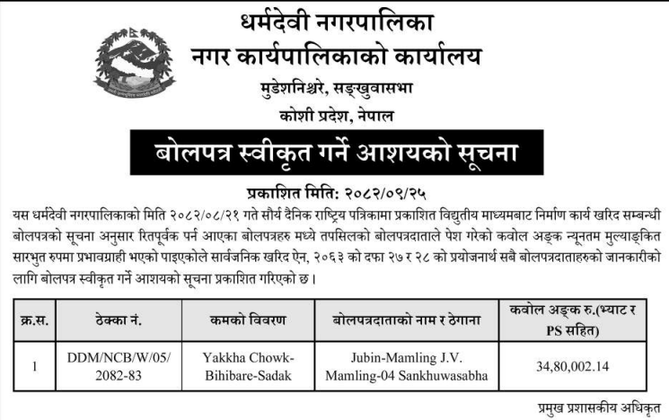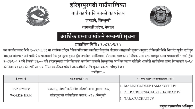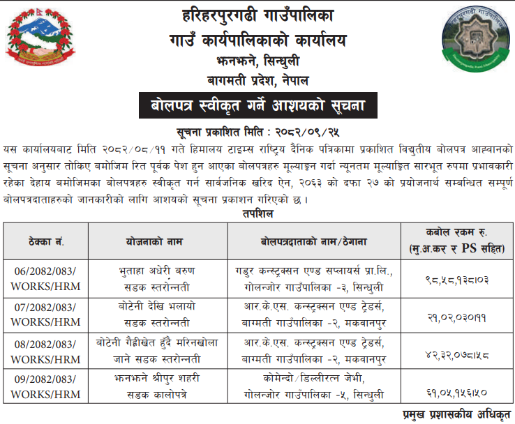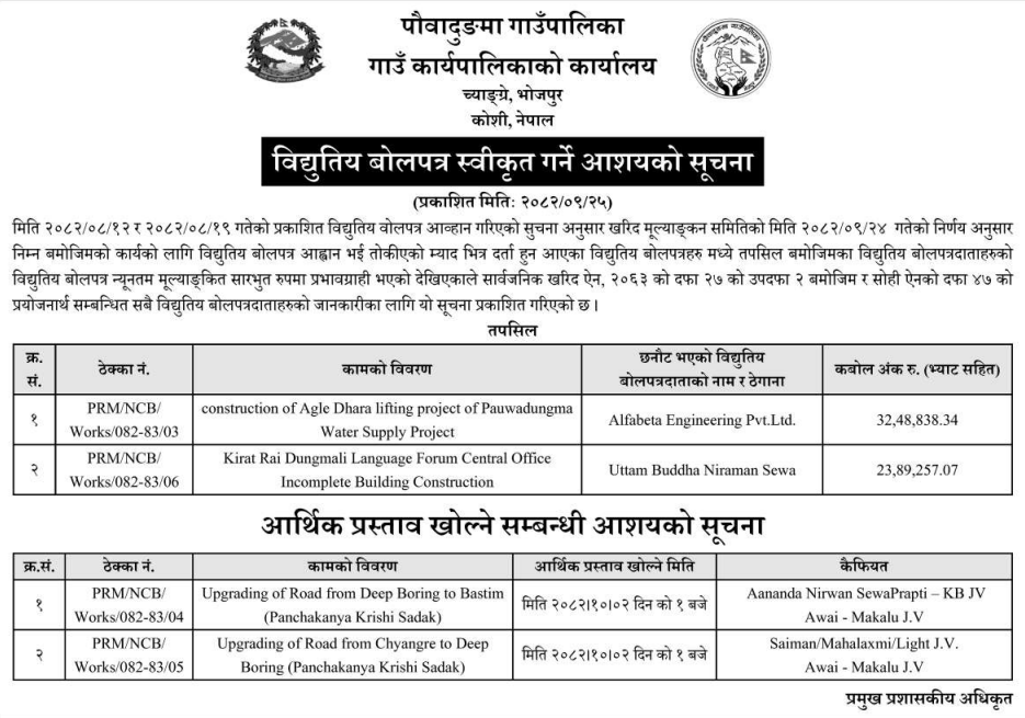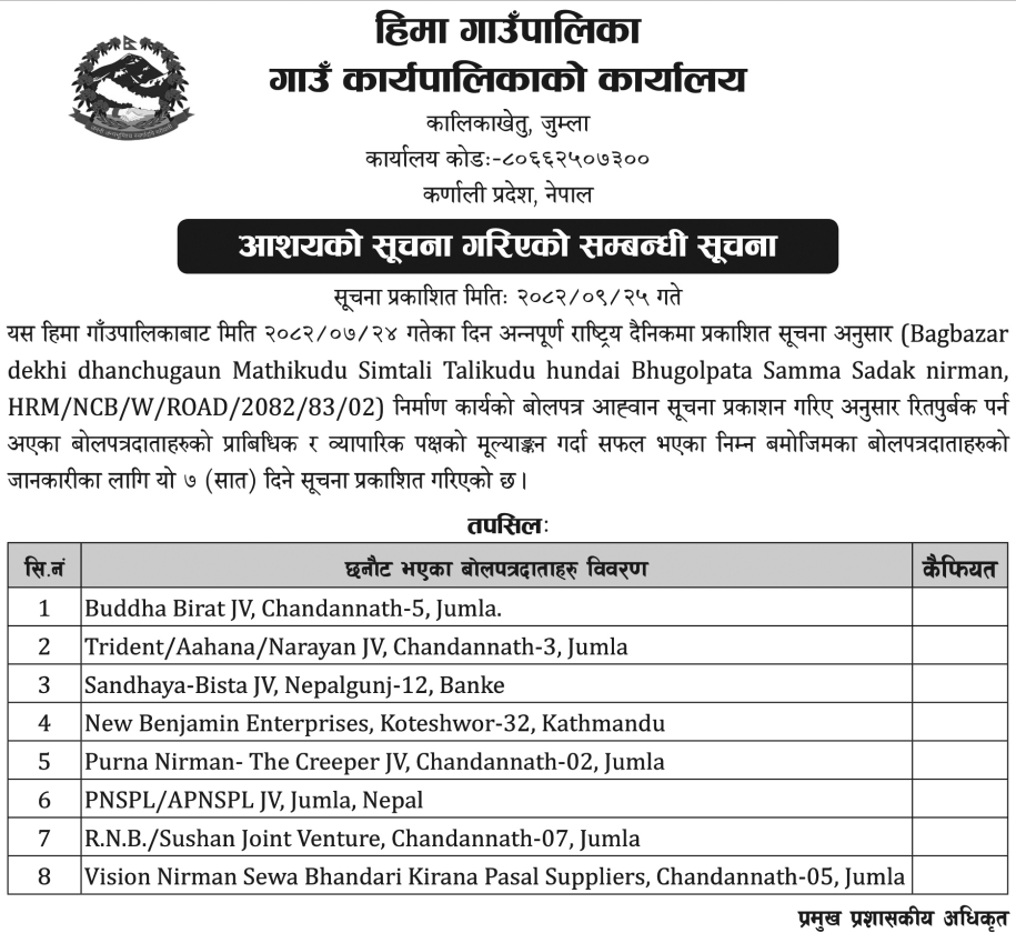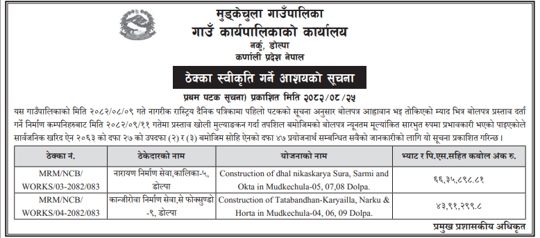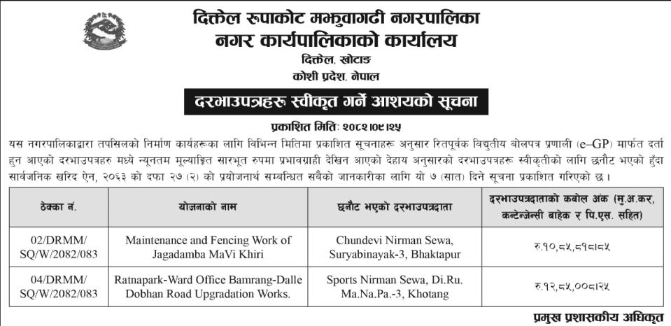| 16 | Malika Rural Municiplality | Upgrading of Simaltari Marbhung Arkhawang Road | 08/01/2026 | PPMO | 08/02/2026 | Click Here | |
