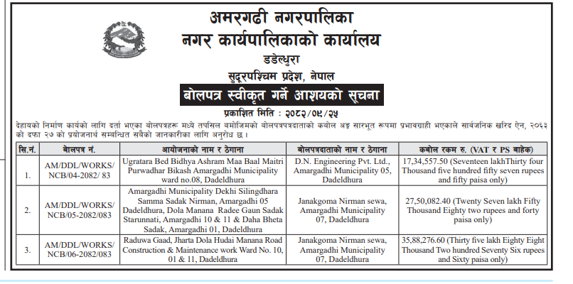 प्रदेश ७ मा प्रकाशित निर्माण सम्बन्धी बोलपत्र तथा आशयका सुचनाहरु