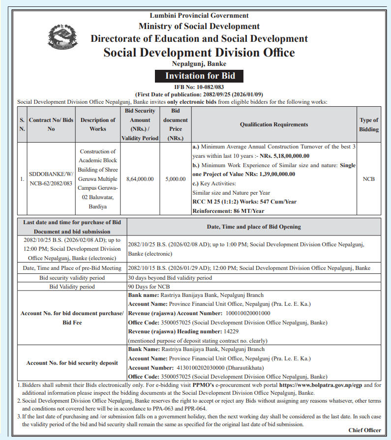 | 102 | Social Development Division Office,Kapilvastu | Construction ofschool building of jana sewa Aa.Bi bhu.na.pa 10, arghakhanchi | 08/01/2026 | PPMO | 23/01/2026 | Click Here | |