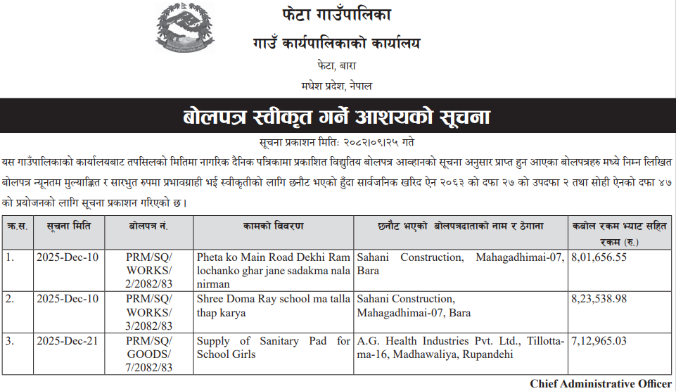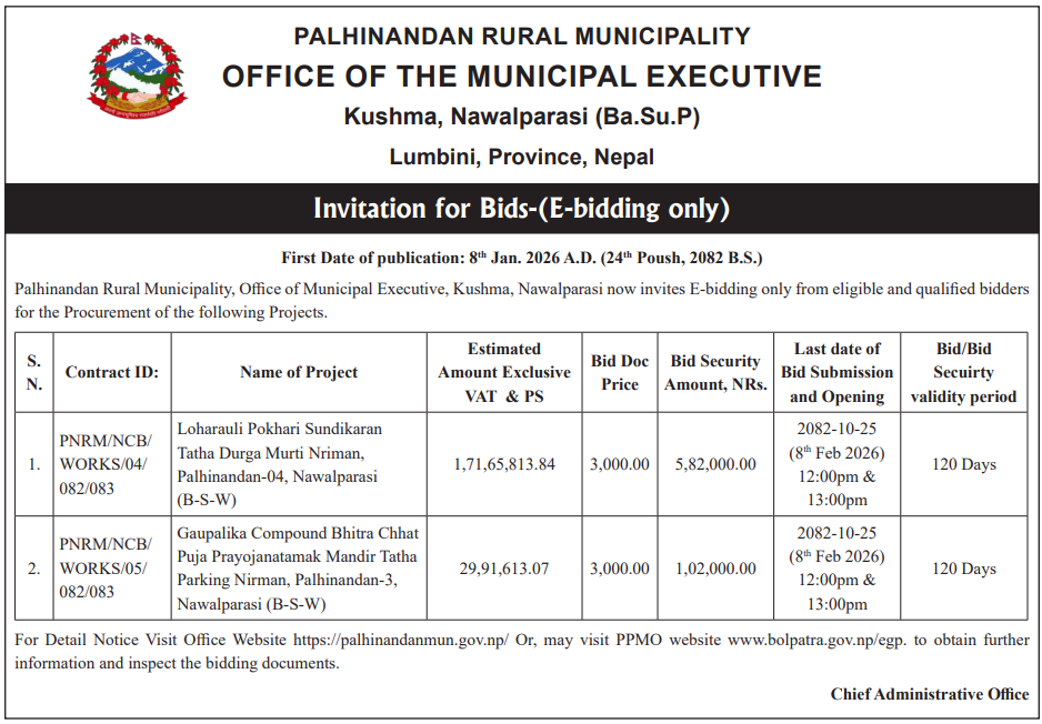 | 19 | Palhi Nandan Rural Municipality Office, Lumbini Province, NAWALPARASI WEST; | Gaupalika Compound Bhitra Chhat Puja Prayojanatamak Mandir Tatha Parking Nirman,Palhinandan-3,Nawalparasi(B-S-W) | 08/01/2026 | PPMO | 08/02/2026 | Click Here | |