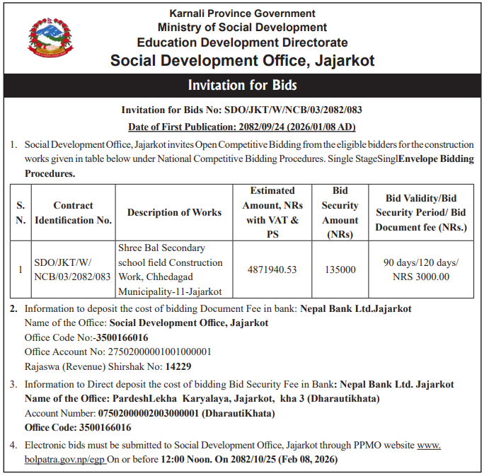 | 28 | Social Development Office, Jajarkot | Shree Bal secondary school field construction work,Chhedagad municipality,11,Jajarkot | 08/01/2026 | PPMO | 08/02/2026 | Click Here | |