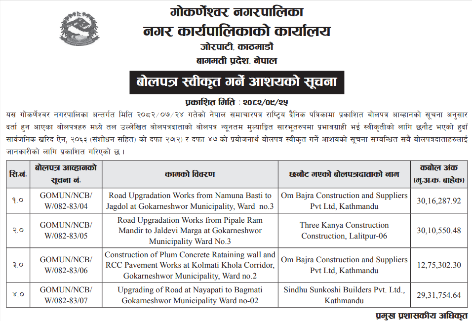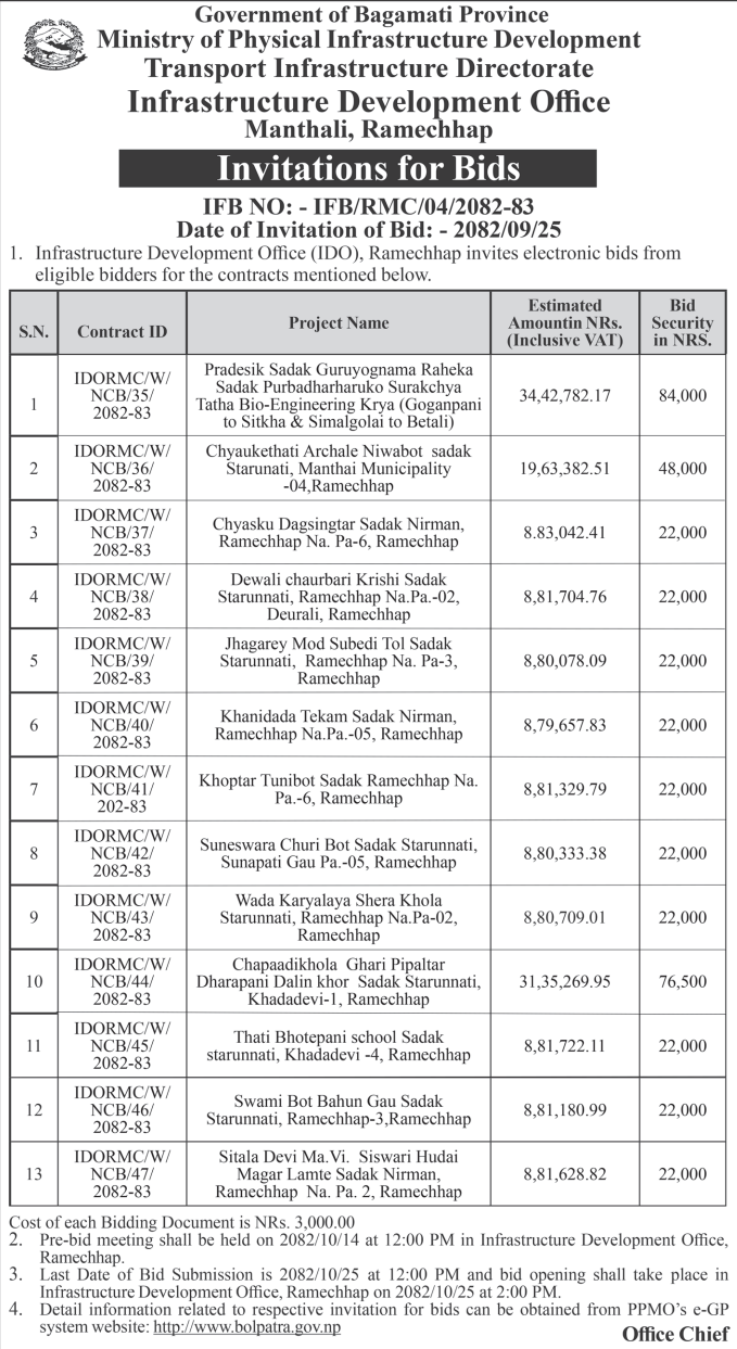 | 32 | Tarakeshwor Municipality Office, Bagmati Province, KATHMANDU; | Construction Works of Baluwa Khet hudai Mahadev Khola Dhakal Gaaun Sadak Estarrunnati | 08/01/2026 | PPMO | 08/02/2026 | Click Here | |