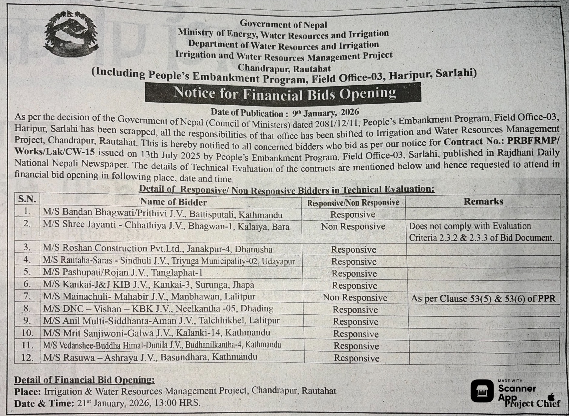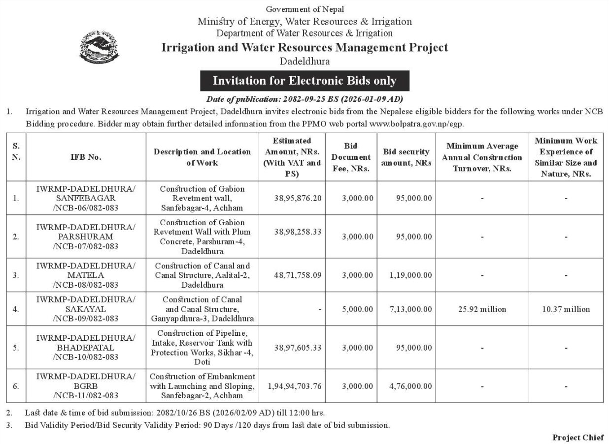 | 169 | Koshi and Bokraha river Management Project | Construction of Vertical Revetment and Launching Apron in Seuti River (R/B and L/B) D/S of Collapsed Bridge at Ramdhuni-09, Sunsari | 08/01/2026 | PPMO | 09/02/2026 | Click Here | |