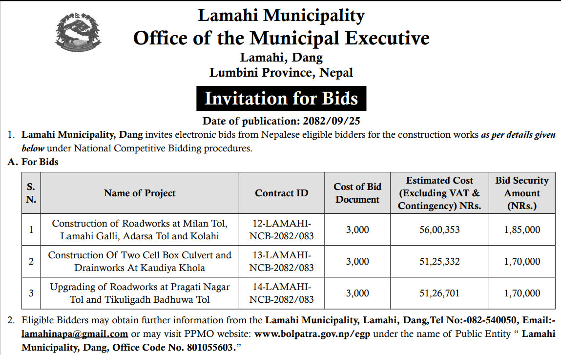 | 51 | Dhunibeshi Municipality,Dhading | Bhattay Dhanda Kulchandra School Sadak Samrakshan Ward no 4 | 08/01/2026 | PPMO | 23/01/2026 | Click Here | |