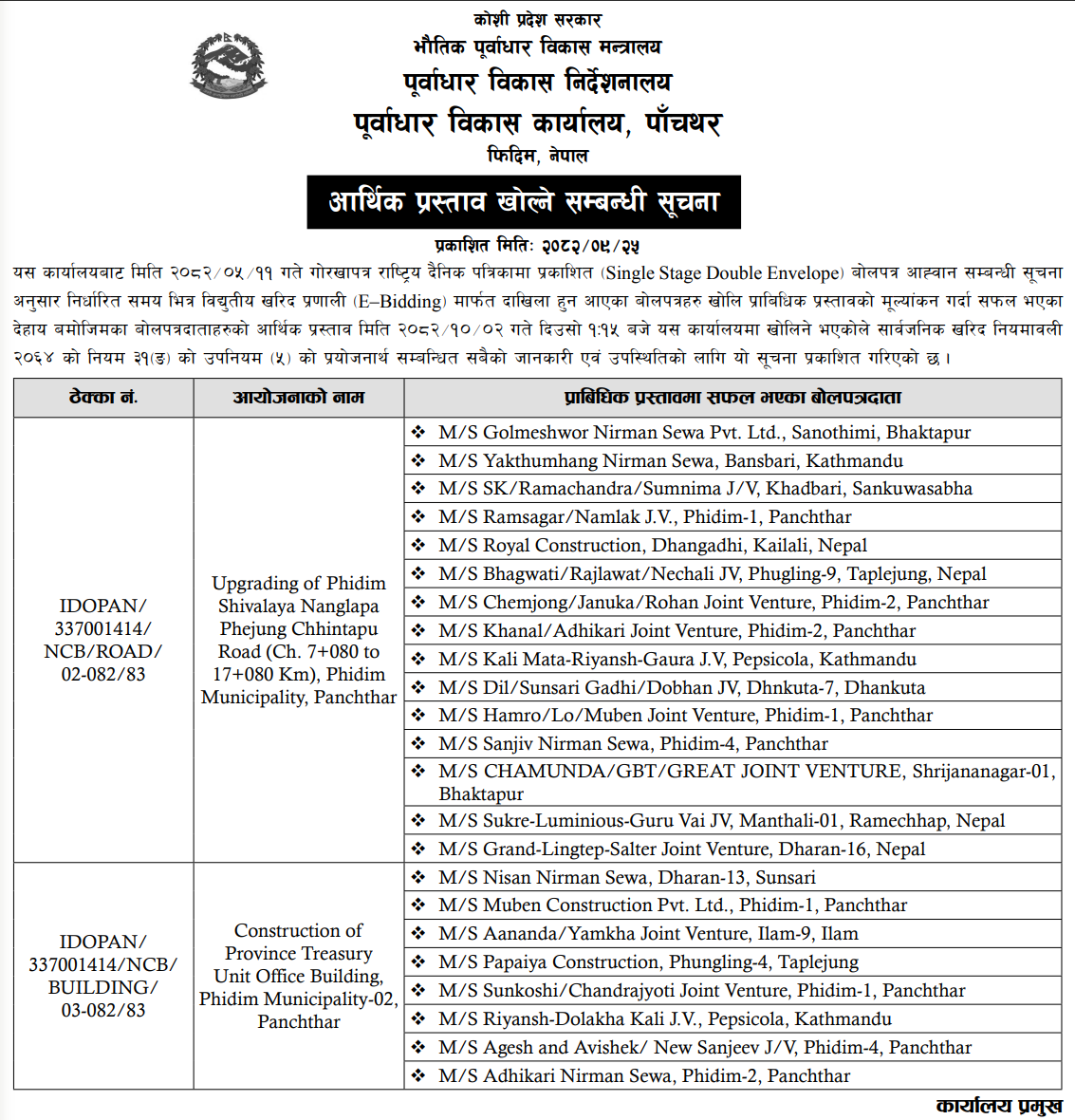 प्रदेश १ मा प्रकाशित निर्माण सम्बन्धी बोलपत्र तथा आशयका सुचनाहरु