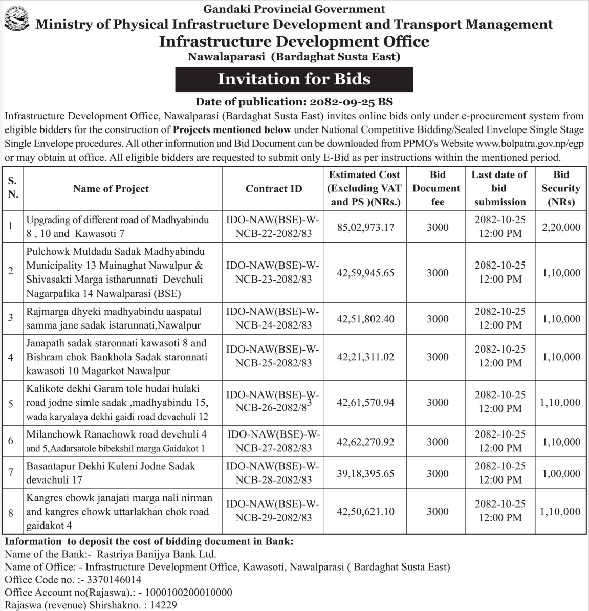 | 177 | Devchuli Municipality Office, Gandaki Province, NAWALPARASI EAST; | Construction Of Different Section of Road In Ward 6 ,7 And Building in Ward 6. | 08/01/2026 | PPMO | 08/02/2026 | Click Here | |