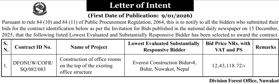 | 47 | Nechasalyan Rural Municipality Office, Koshi Province, SOLUKHUMBU; | Ongoing construction of the Kirat Bhumethan building | 08/01/2026 | PPMO | 23/01/2026 | Click Here | |