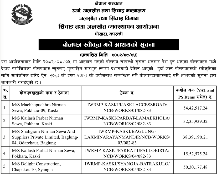 प्रदेश ४ मा प्रकाशित निर्माण सम्बन्धी बोलपत्र तथा आशयका सुचनाहरु