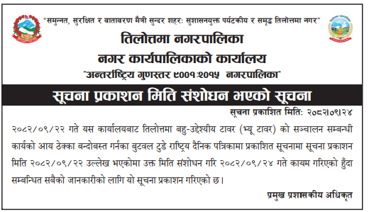 | 184 | Tilottama Municipality Office, Rupandehi | Tilottama Bahu-Uddeshyiya Tower Sanchalan Karya | 08/01/2026 | PPMO | 08/02/2026 | Click Here | |