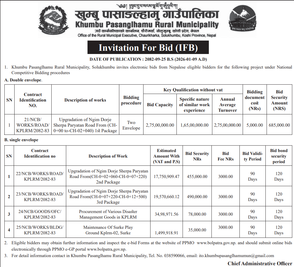 | 88 | Rolpa Municipality Office, Lumbini Province, ROLPA; Phaktanglung Rural Municipality Office, Koshi Province, TAPLEJUNG; | Nepal rastriya aabi field nirman rolpa napa 6. | 08/01/2026 | PPMO | 23/01/2026 | Click Here | |