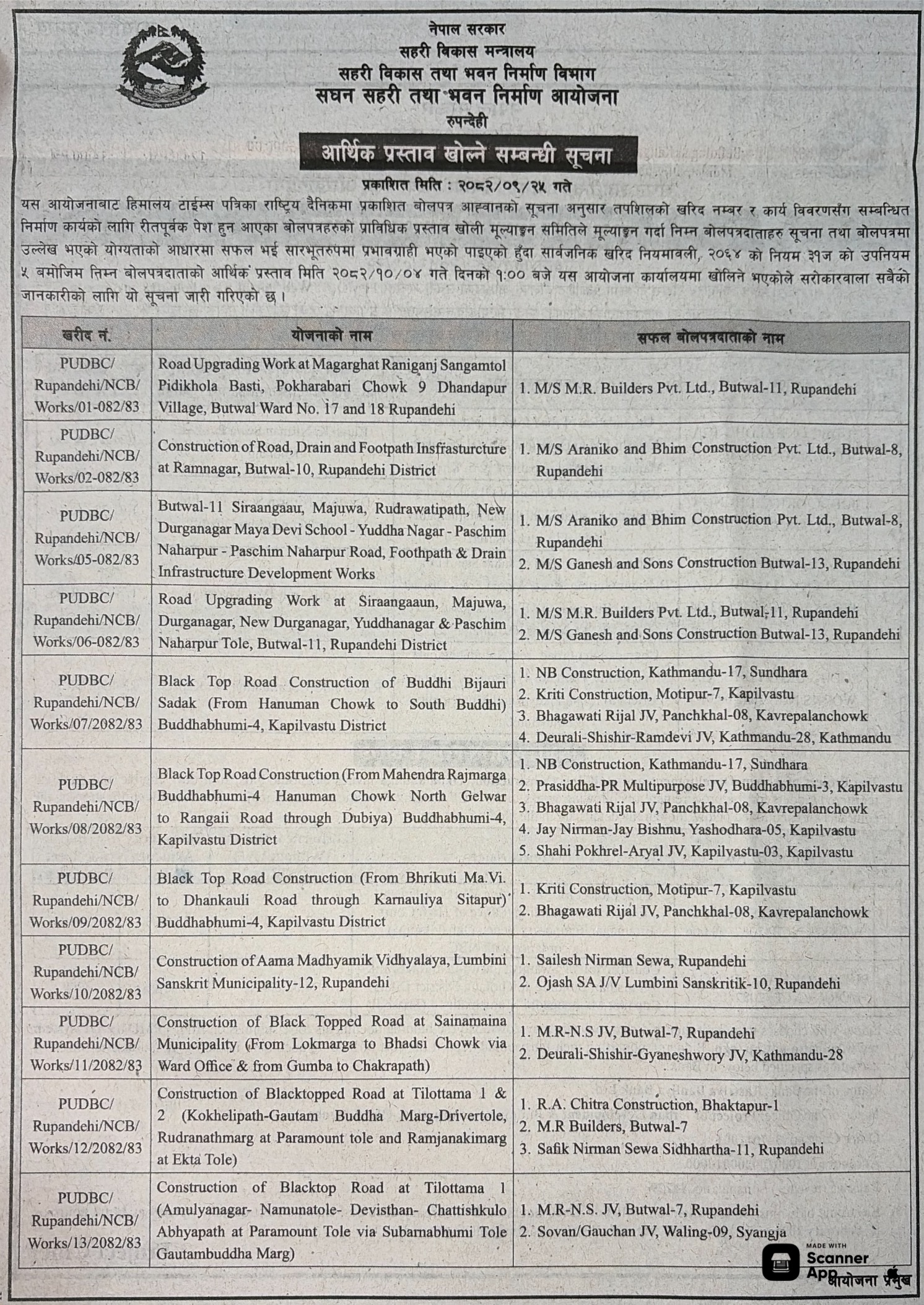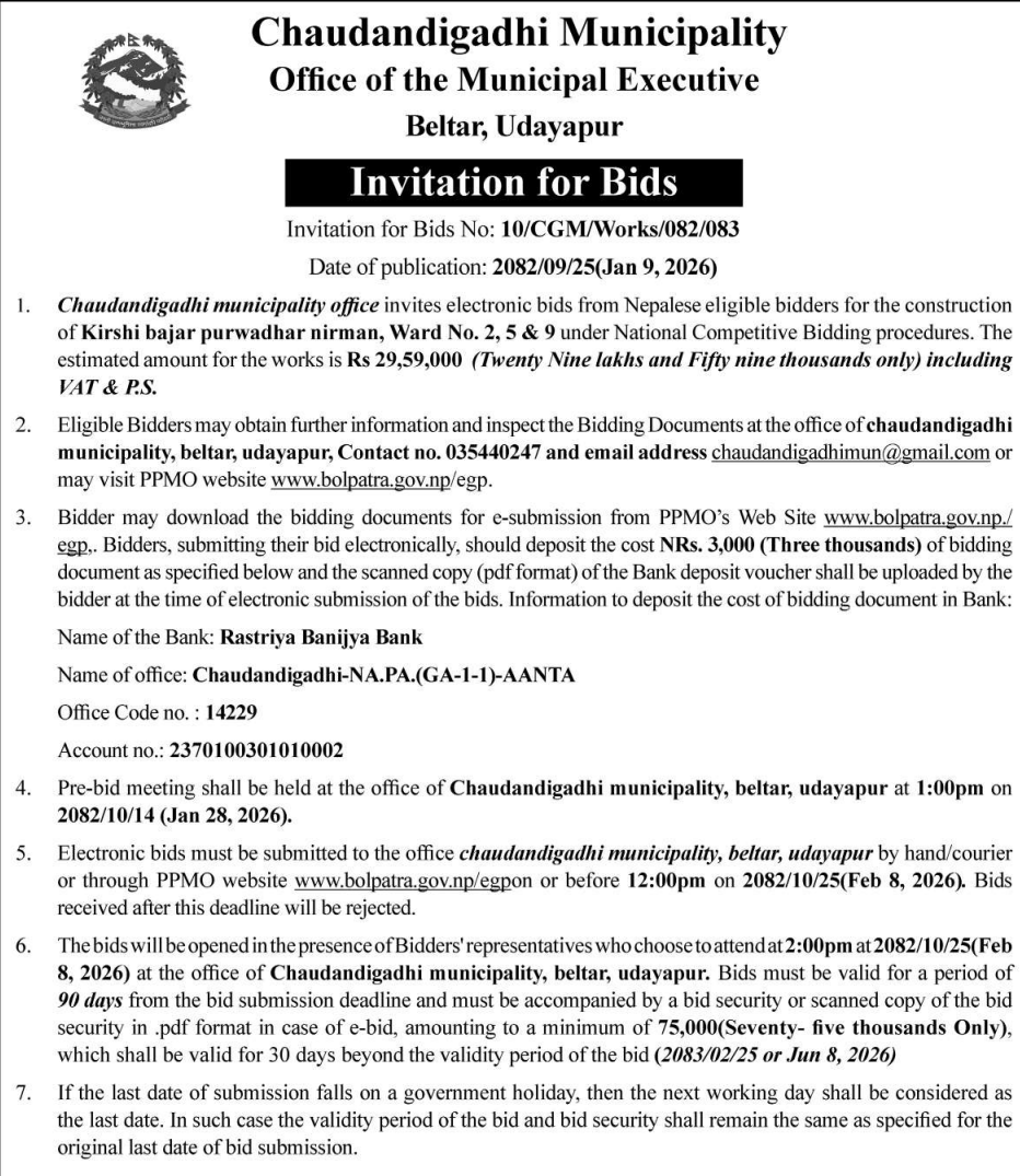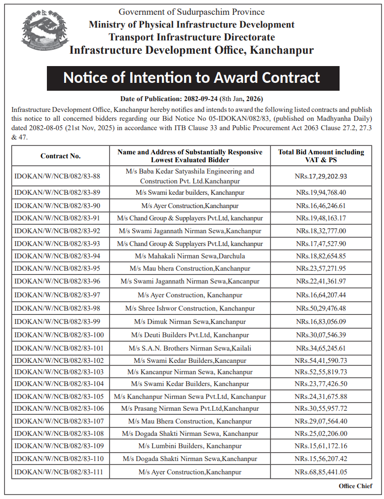 | 103 | Madi Municipality Office,Chitwan | Badarjhula(Hanumanjhula) Sahari Swasthy kendra Sudhridikaran, Madi-9 | 08/01/2026 | PPMO | 23/01/2026 | Click Here | |