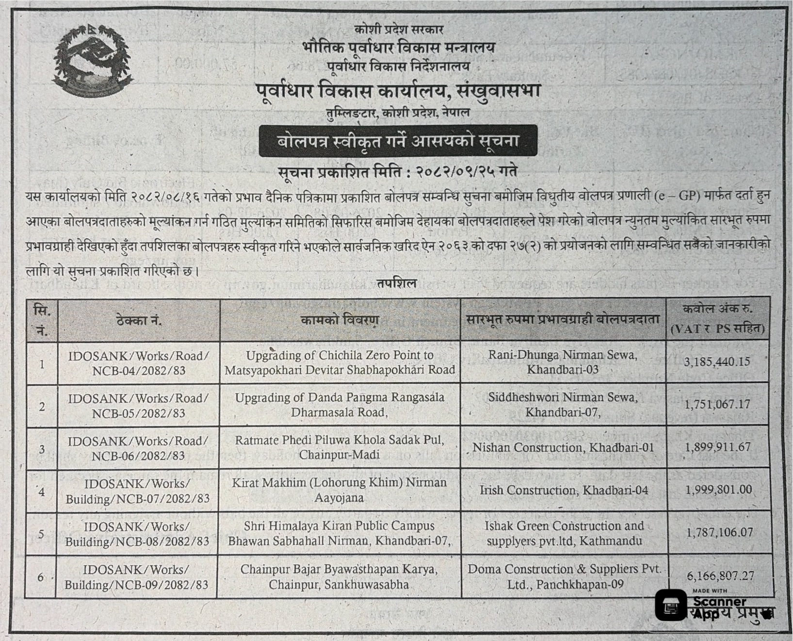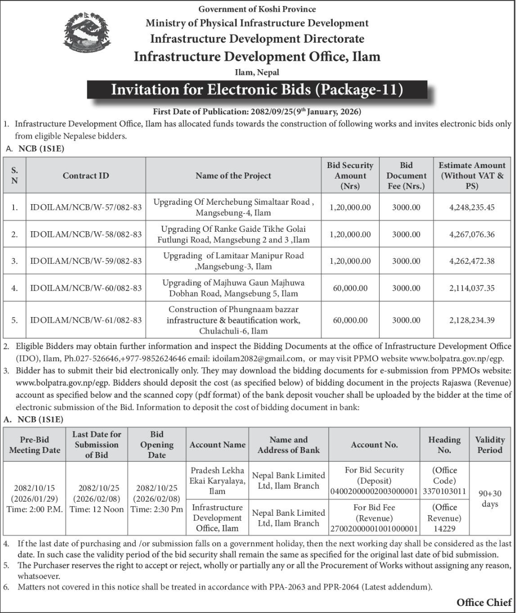 | 6 | Infrastructure Development Office,Sankhuwasabha | Upgrading of Madi Na.Pa. Mangalbare Mulkharka to Okharbote Road, Sankhuwasabha | 08/01/2026 | PPMO | 08/02/2026 | Click Here | |