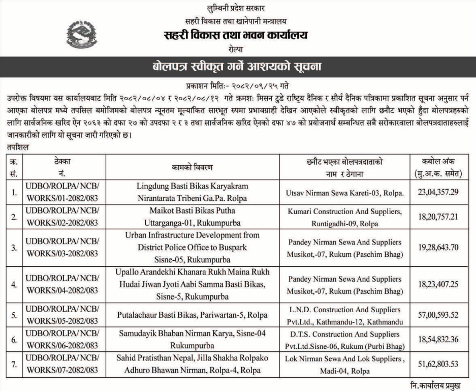 | 23 | Rolpa Municipality Office, Lumbini Province, ROLPA; | Prashasanik bhawan dekhi dhaban dekhi aaune bato nirman yojana. | 08/01/2026 | PPMO | 08/02/2026 | Click Here | |