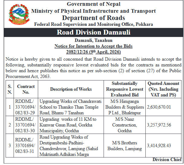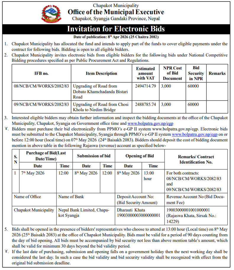 | 35 | Chapakot Municipality | Upgrading of Road from Chosi Khola to Nirdim Bridge | 08/04/2026 | PPMO | 08/05/2026 | Click Here | |