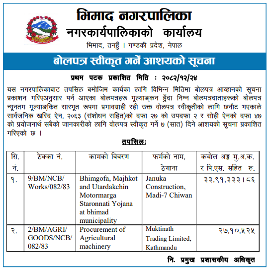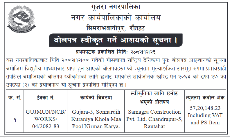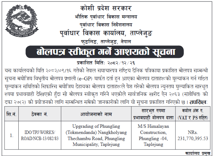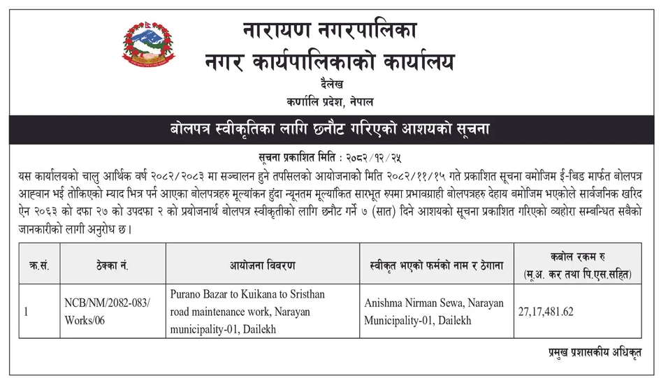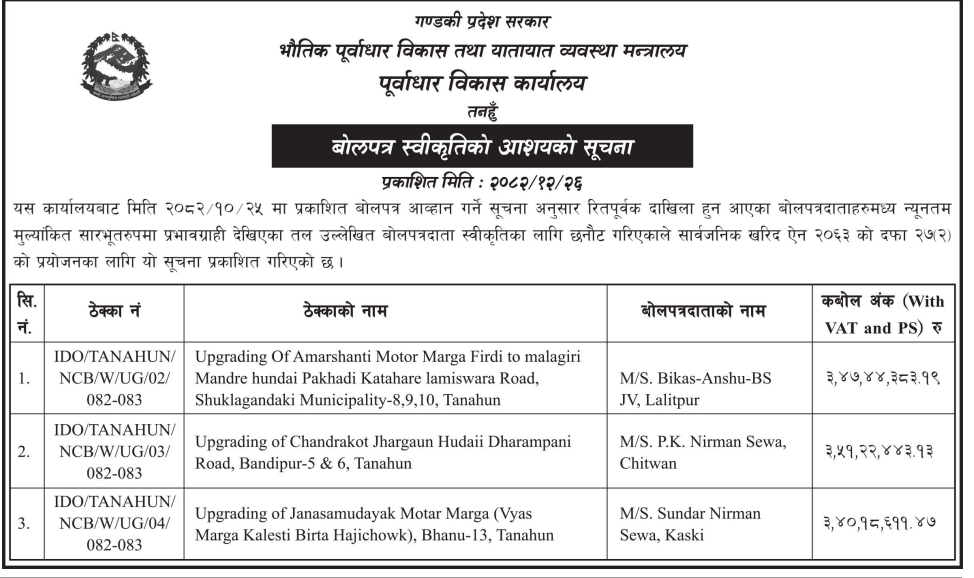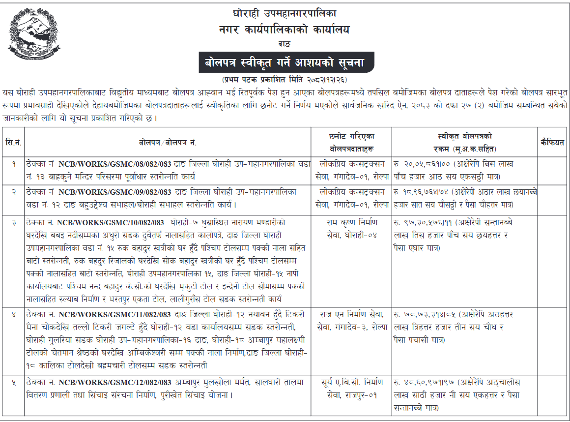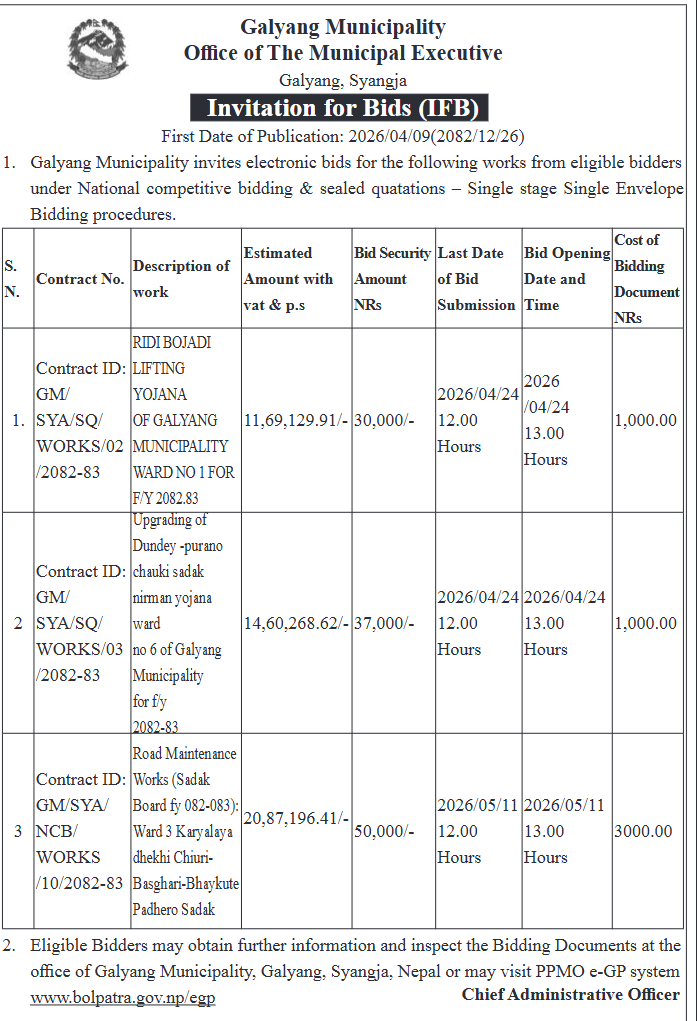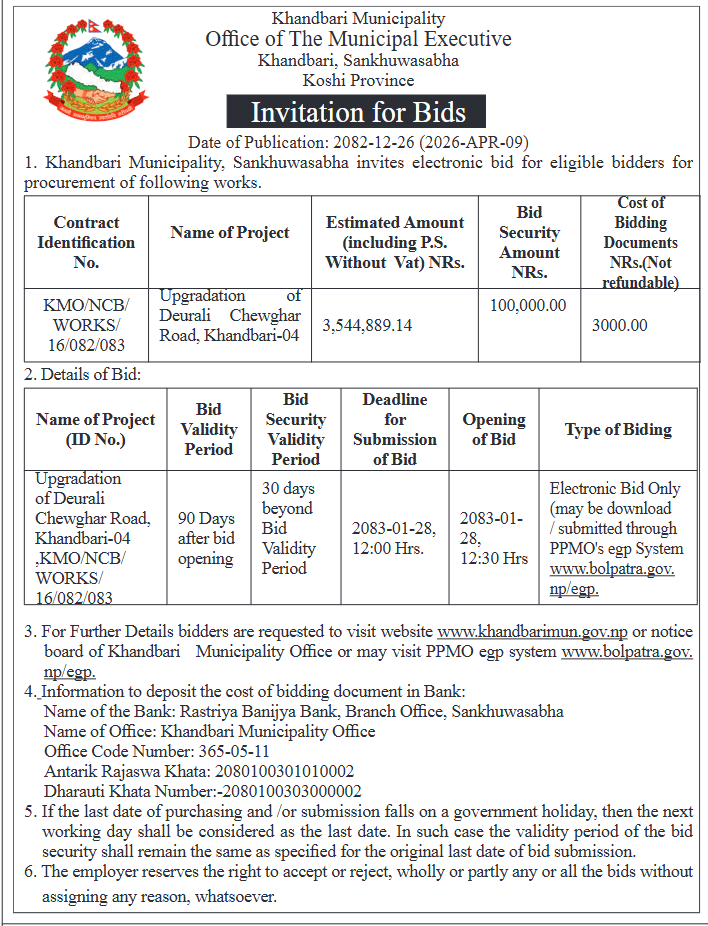 | 189 | Pokhara Metropolitan City Office | Upgarding Ryalechaur Bisauna Mauja Road, PMC - 20 (Contract ID: 119/PMC/NCB/W/Purbadhar/082-83) | 08/04/2026 | PPMO | 08/05/2026 | Click Here | |
